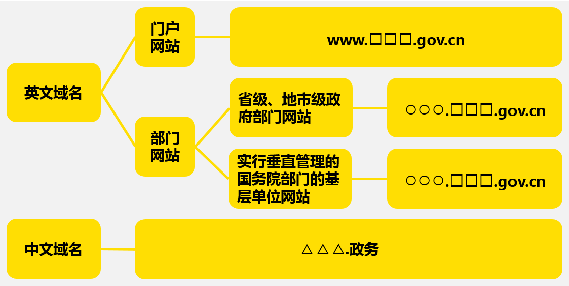根据此次国务院办公厅下发的通知,今后政府网站统一以“.gov.cn”为后缀的英文域名和以“.政务”为后缀的中文域名,不得再使用其他后缀的域名。不承担行政职能的事业单位原则上不得使用以“.gov.cn”为后缀的英文域名。