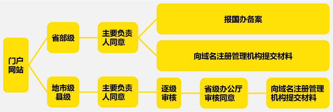 通知要求,各省部级政府门户网站域名的注册或注销,要经本地区、本部门主要负责人同意后,报国务院办公厅备案,并向域名注册管理机构提交申请材料。地市级、县级政府门户网站要经本地区主要负责人同意后,逐级上报审核,最终由省级政府办公厅向国家域名注册管理机构提交申请材料。国家域名注册管理机构依法依规对信息进行核验,核验通过后,在3个工作日内完成注册或注销工作。